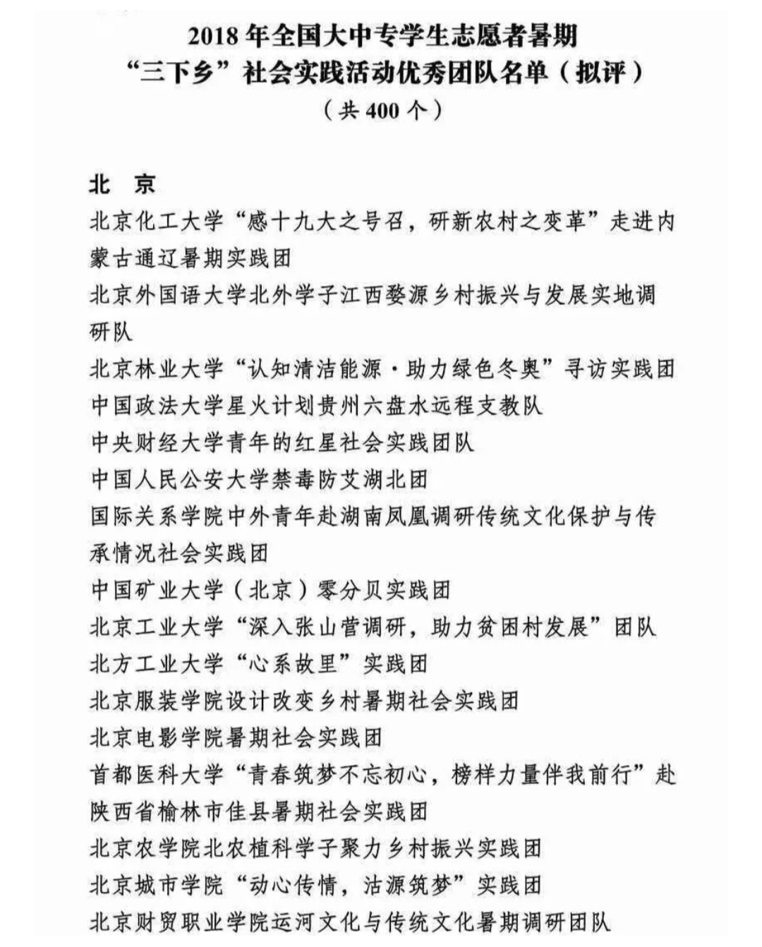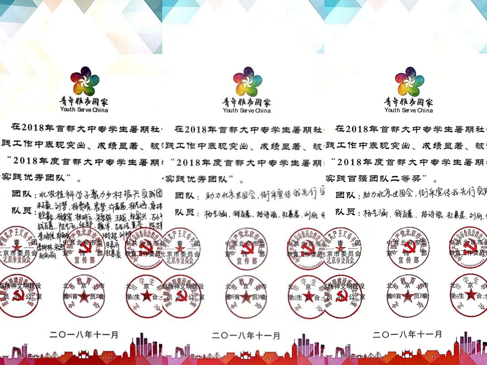 2018年度首都大中专员工暑期社会实践优秀团队:太阳成集团tyc151cc“助力北京世园会,街采宣传我先行”实践团;太阳成集团tyc151cc “北农植科学子,聚力乡村振兴”实践团