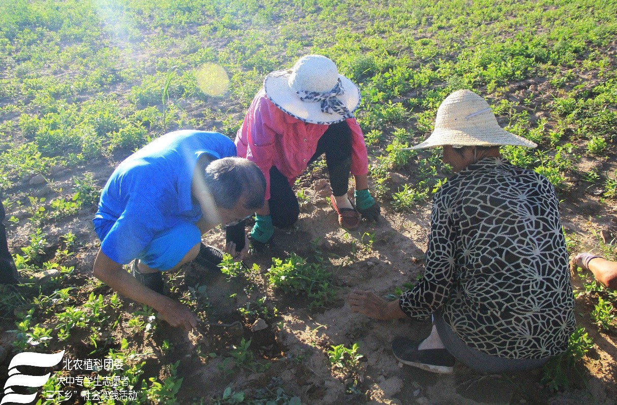 紧接着,实践团来到了官队营村,该村苹果梨种植大户听说果树专家的到来,热情地邀请实践团成员们前往果园参观指导。张杰老师为种植户提出了很多针对性意见,如果树间要留有一定间距,不可互相干扰;2.5米以上的树枝要及时压枝;树下树冠投影范围内不要有杂草等等。之后实践团马不停蹄地赶往中草药种植地——桔梗种植地,药农面对植物保护专家,诉说了种植中遇到的难题。缺乏技术支持、桔梗发苗率不高、苗长势不齐、死苗现象时有发生、机械播种导致的株间距不等,等等,都影响着桔梗的产率,更影响着药农的收益。种植专业知识的缺乏也成为限制农民受益的主要因素之一。