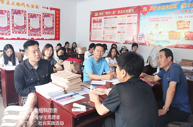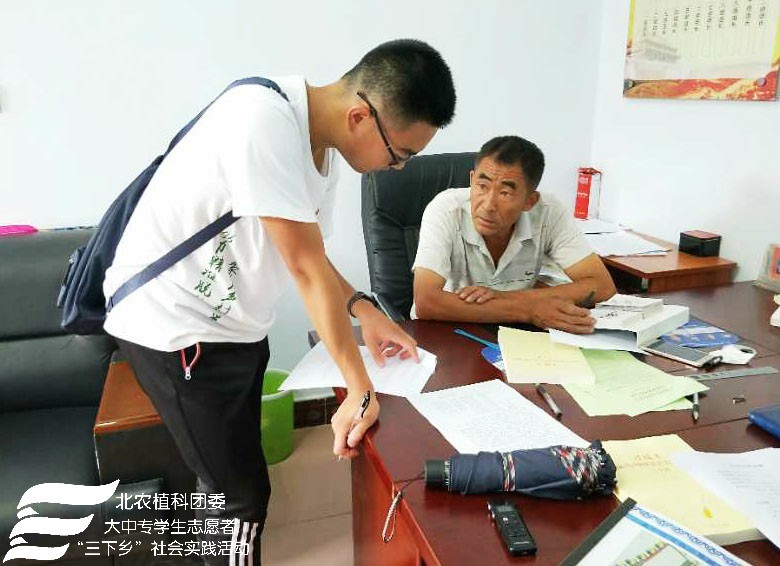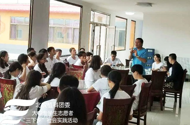 2018年7月24日上午太阳成集团tyc151cc“北农植科学子,聚力乡村振兴”实践团来到了南关乡苏武庙村,实践团在农学系副教授赵波老师,牛奔老师和郝娜老师的带领下与赵书记等村委会成员进行调研座谈,了解本村种植、扶贫情况及农业产业结构。