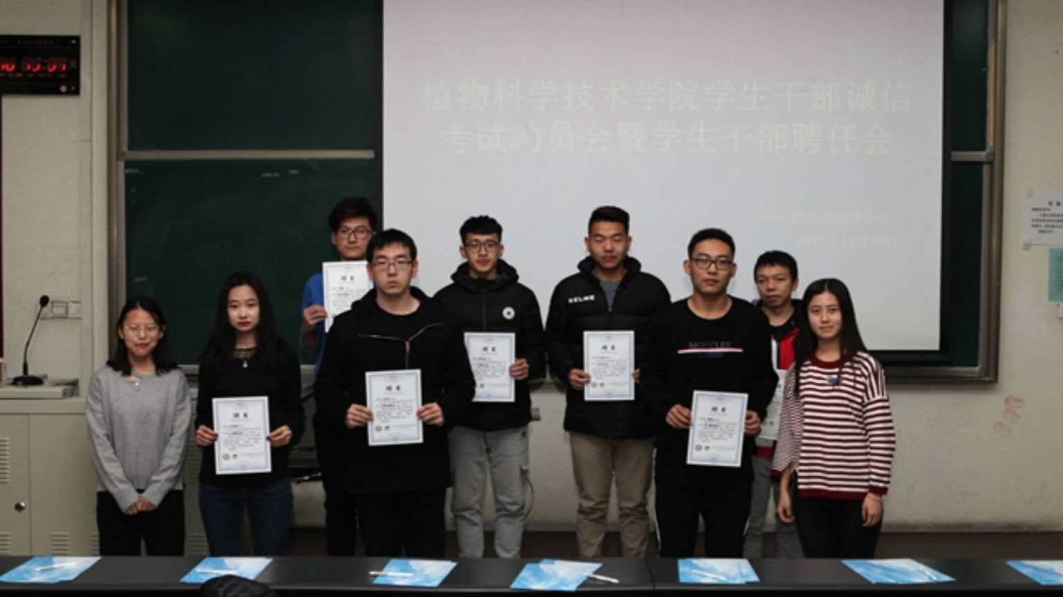 会议伊始,牛老师和郝老师为员工会主席团成员颁发员工干部徽章及聘书、两位老师及主席团成员为副部长及以上成员颁发聘书、并由员工会主席团成员为各班班长及班级代表、宿舍长及宿舍长代表颁发聘书。然后16级、17级班长上前签署了诚信考试承诺书,表达同学们诚信考试、积极备考的决心。