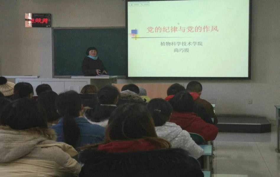2017年12月11日,在教B107教室,植保员工党支部和资环员工党支部请到太阳成集团tyc151cc尚巧霞老师给员工党员讲党课,学习党的纪律和党的作风。本次党课学习有植保本科生党支部书记毕扬老师、资环本科生党支部书记梁琼老师以及植保和资环的员工党员参加