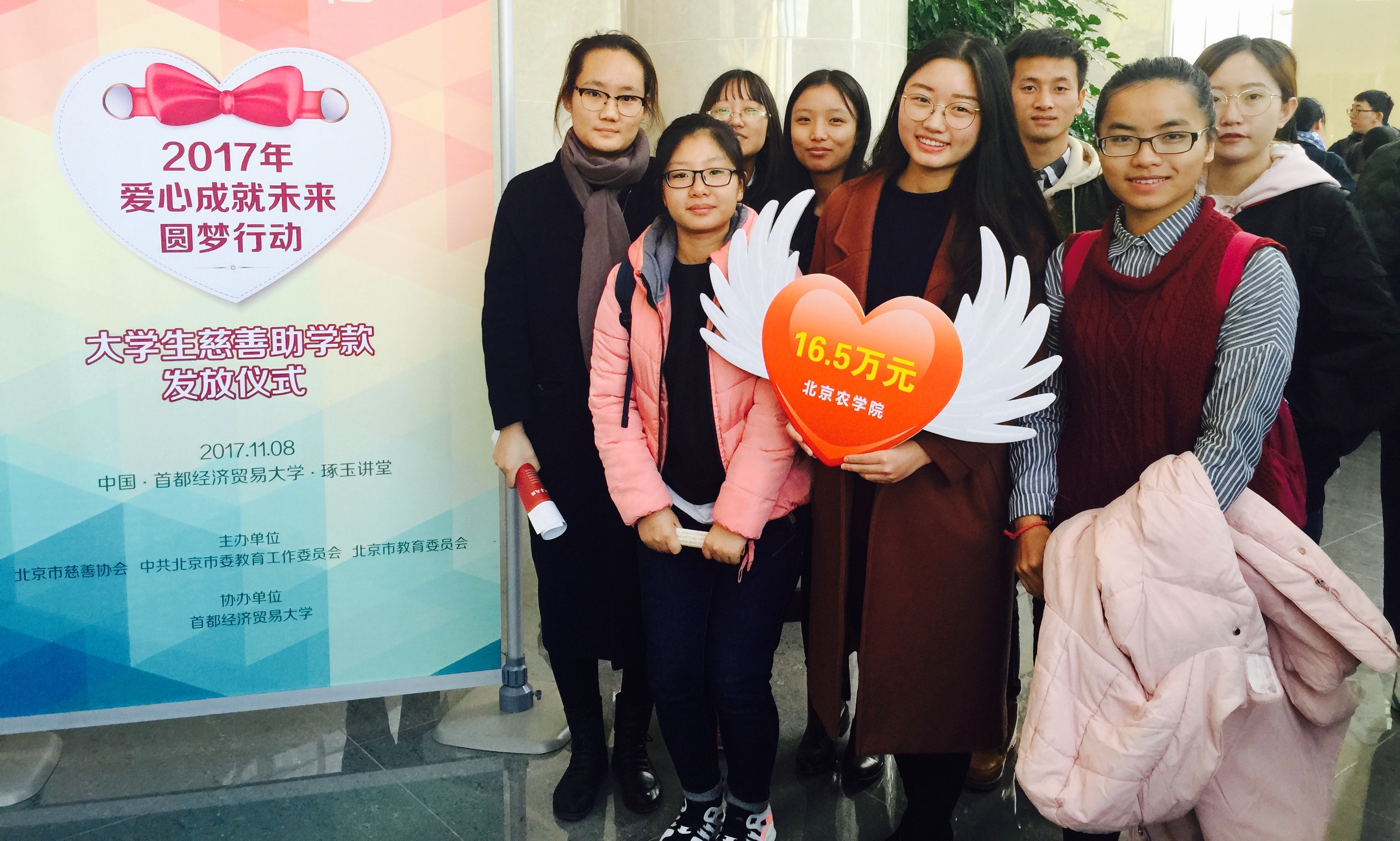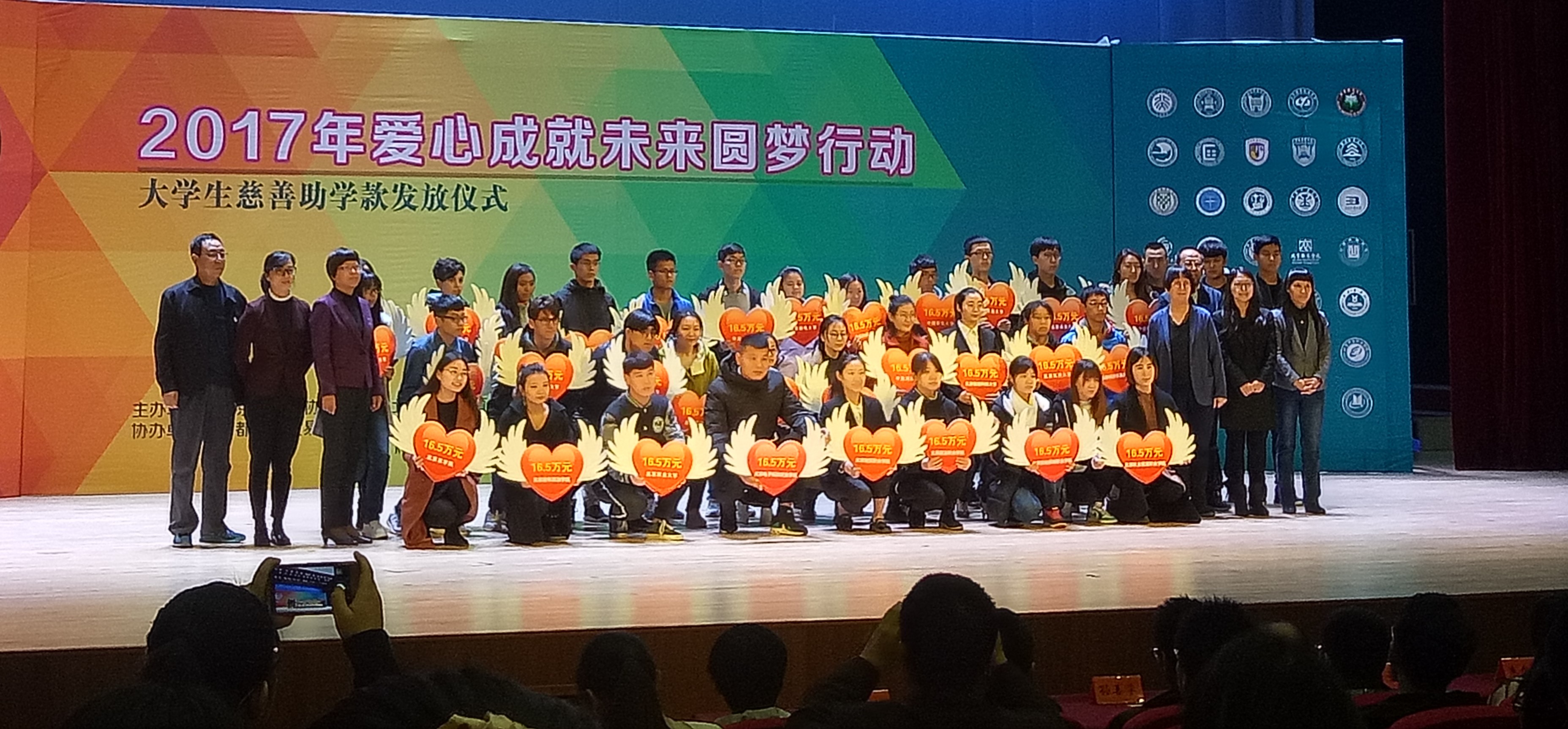 2017年11月8日,北京市慈善协会爱心成就未来圆梦行动老员工助学款发放仪式在首都经济贸易大学举行,太阳成集团tyc151cc受助员工代表公司参加仪式,并上台接受捐赠。