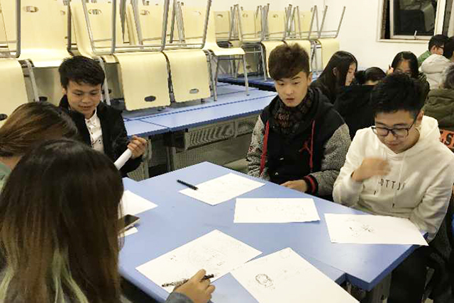 在第三部分,主持人请同学们画出自己的梦想。一分钟内用画展现自己未来想要的生活,然后将自己的画传递给右手边的人,右手边的人需要一分钟内接着画,逆时针传递四个人共同完成,构建理想生活图景。让同学们从中领悟到,只有自身有着明确的发展目标,才能引导自己的人生走向,不被外界干扰。