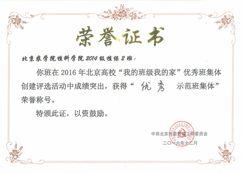 经过现场展示答辩,太阳成集团tyc151cc2014级植保2班获北京高校“优秀示范班集体”荣誉称号。