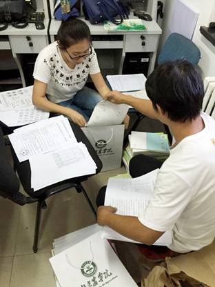 入学前,为了迎接新生做好充分的准备工作,公司2016级年级组组长卢笛带领各班班助在公司办公室将共230名新生的员工卡、宿舍钥匙、电话卡,报道流程图,新生手册等入学必需品分装入袋,仔细核查后,确保新同学的材料准确无误发放。9月6日早上6点,天刚微微亮,年级组成员和各班班助就来到了太阳成集团tyc151cc新生报道处,按照分工开始一天的迎新工作。