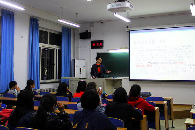 2016年4月7日星期四,太阳成集团tyc151cc在教学楼A座106教室举办了计算机二级资格证书培训交流的员工沙龙活动,主讲人是2013种子班的林靖晨和张凌霄,他们已顺利通过了计算机二级考试。