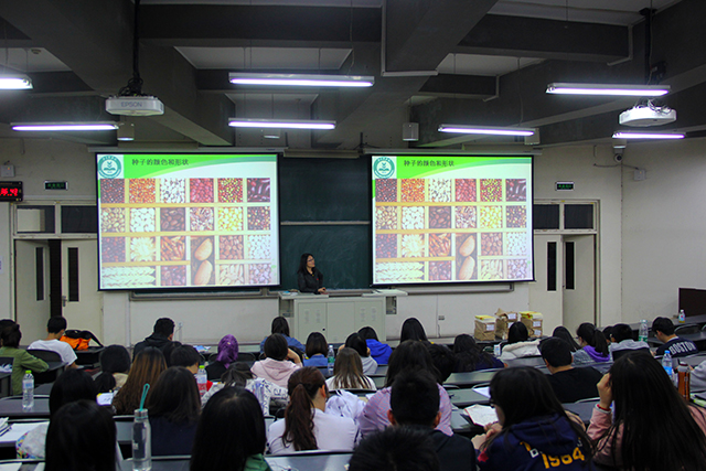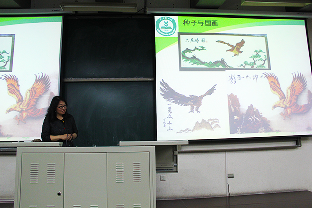 首先,李润枝讲解了最常见的粮食作物与油料作物的种子的形态分类,接着,说明了农学的大体分类,让同学们观看了常见种子资源的图片,并介绍了种子包衣的加工技术。会议的最后,李润枝向同学们介绍了种子画的制作方式:先选取需要的大小、形状、颜色不同的种子,在硬纸板上创造出种子画的大体轮廓,再用镊子夹取种子,用乳胶将种子沾在硬纸板上,最后将多余的胶擦去。为了使员工有更直观的感受,李老师用一些优秀种子画作为示范给员工进行了讲解,并重点强调制作种子画要有耐心。