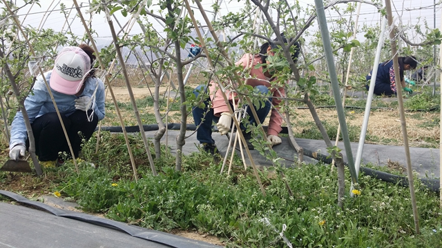 员工们分别拿着锄头和装满了肥料的小桶,在葡萄树旁忙和起来。你锄土,我施肥,配合的十分默契,虽然汗流浃背,但是望着一行行的劳动成果,都觉得干劲十足。