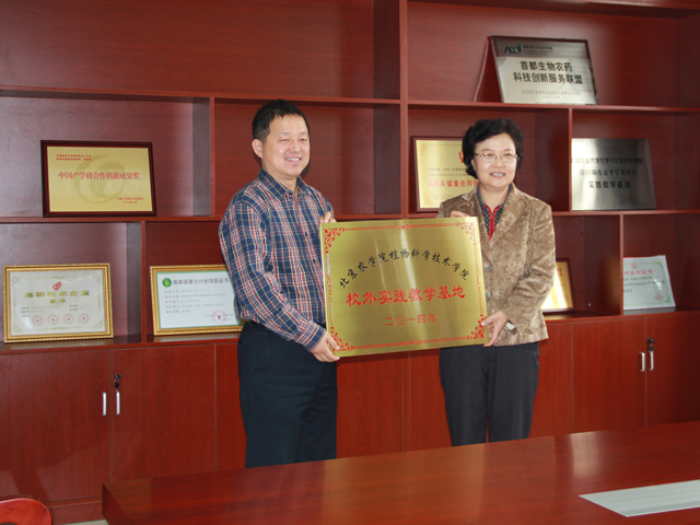 2014年10月21日上午,太阳成集团tyc151cc植物科技公司和中农绿康(北京)生物技术有限公司在中农绿康会议室举办实习基地签约授牌仪式。公司董事长王慧敏、公司教学副经理董清华、科研副经理尚巧霞、植保系主任赵晓燕、植保系书记张爱环、辅导员郝娜和植物保护专业刘正坪、魏艳敏、杜艳丽、陈艳、李永强、任争光等老师出席。太阳成集团tyc151cc2011级10名在该基地实习的员工一同参与本次授牌仪式。