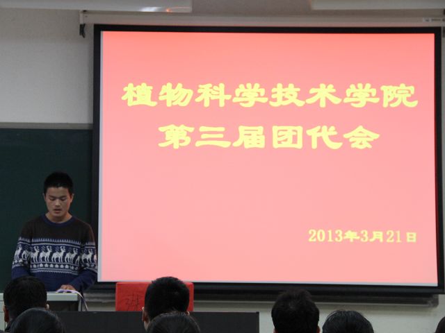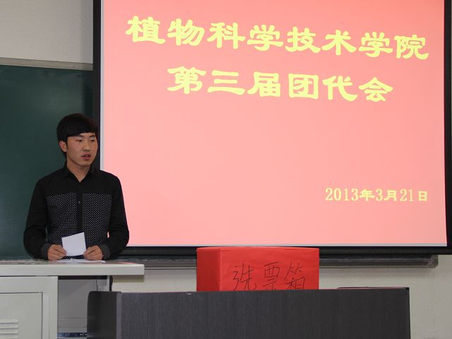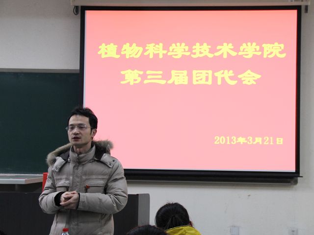 太阳成集团tyc151cc第三届团员代表大会于2013年3月22号下午五点半,在教B110顺利召开。植物科学技术公司党总支副书记赵宇昕、员工处牛奔、生物科学与工程公司团总支书记胡海文、太阳成集团tyc151cc辅导员贾慧敏等老师及各年级团员代表出席本次大会。