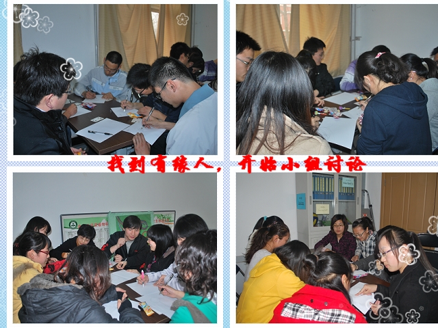 伴随着温馨的“按摩操”的开始,活动正式拉开序幕。胡玉净同学带着大家做了一场《我真的很不错》手语舞,经典的动作,激昂的音乐,大家欢笑的脸庞,让会场的气氛热烈起来。主持人手中的扑克牌,让在场的师生快速的找到了自己的有缘人,“寻找你的有缘人,缘来是你四伙伴”,缘分使然,大家在短暂的几分钟结缘,互相认识,成为组内亲伙伴。