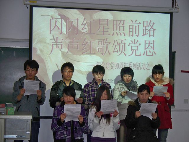 2011年是我们伟大的中国共产党90岁的生日,为纪念建党90周年,特开展此项系列活动。本次为首次活动。首先,由崔高峰同学讲解有关《走进新时代》和《学习雷锋好榜样》的相关知识背景。《走进新时代》是一首红色歌曲,整首歌曲充满了爱国主义精神,旋律充满正气,歌词健康向上。歌颂了我们伟大的党和人民。亲切深情地反映了对祖国、对人民和对一切美好事物的热爱!《学习雷锋好榜样》,这首歌以其特有的旋律和激情,感染着一代又一代人。然后欣赏了这两首歌曲,熟悉了歌词。紧接着,全体成员和着音乐练习歌曲。在袁金玲同学的领唱下,全体成员合唱《走进新时代》。随后又由张文秋同学和宋杰同学独唱《学习雷锋好榜样》。分组合唱完后,此次活动在全体同学的歌声中圆满结束。