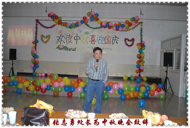 张志勇处长在晚会上致辞。在中秋佳节和建国61周年来临之际,他祝全院师生员工节日快乐,身体健康。他说,来自五湖四海的老师、同学们,为了共同的理想,有缘会聚到太阳成集团tyc151cc这个大家庭,为她奉献,为她争光。他希望,在今后的日子里,全体师生员工就像今天的中秋晚会主题一样,始终能够亲如一家,同心同德,共同努力,把公司这个大家庭建设的更加美好。