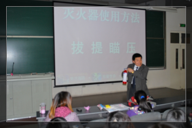 此外,针对不同情况,刘老师介绍了火灾发生时所应采取的措施,并现场演示了在逃生过程中八字节的打法,介绍灭火器的种类及其使用过程中的“提、拔、瞄、压、扫”五个步骤,介绍了火势面前沉着面对、灵活处理的应对措施,强调“要将火情止于萌芽状态,防范胜于救灾,学一点知识,多一份平安。”王老师的讲解丰富、生动、幽默,博得同学们的一片好评,大家表示受益匪浅。