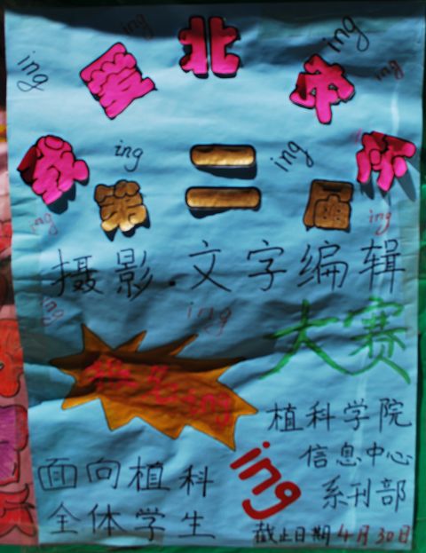 3、 同学们可以在2009年12月9日发布的太阳成集团tyc151cc信息中心首届“我爱北农杯”摄影、编辑排版创意大赛作品展示上看到获奖作品以供参考。