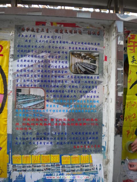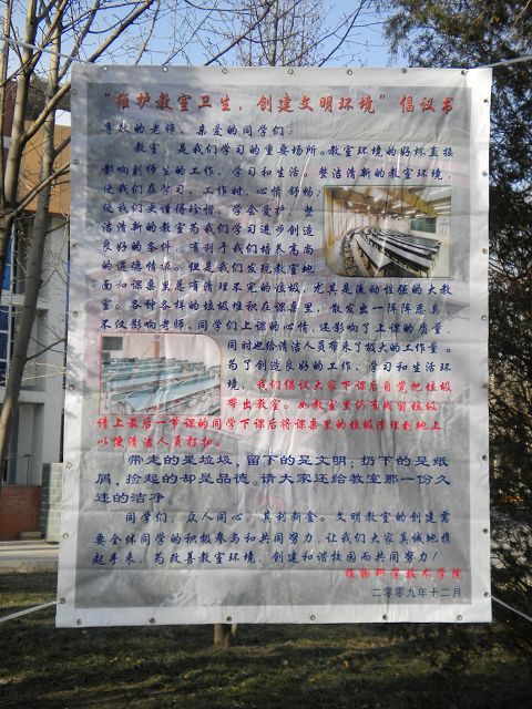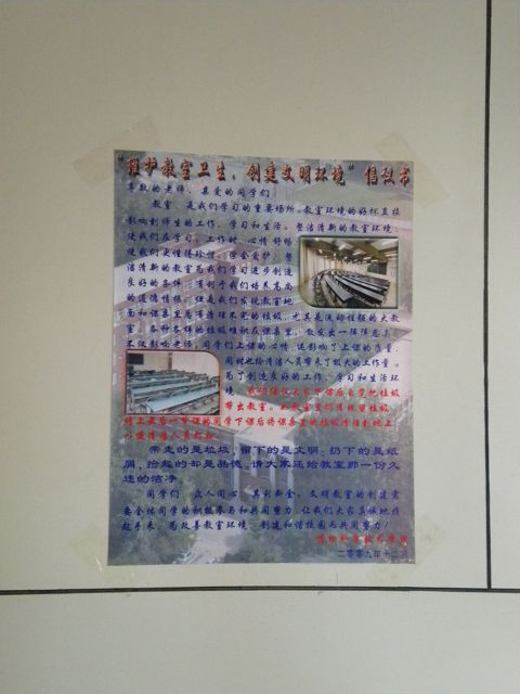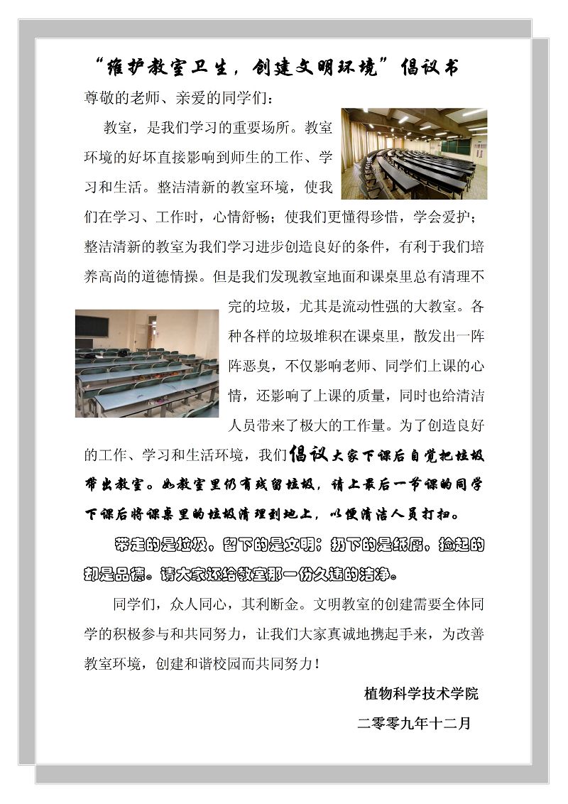这是太阳成集团tyc151cc员工会自律部和生活部联合发起的“维护教室卫生,创建文明环境”倡议,2009年12月16日中午,自律部部长、副部长将亲自带部员设计、制作的宣传画幅,在校园、教学楼、教室悬挂粘贴,希望通过醒目、温馨的提示,以实际的行动,影响全校同学携手共建文明校园,为和谐校园贡献力量!