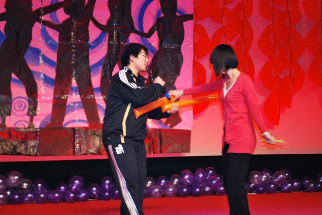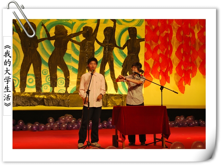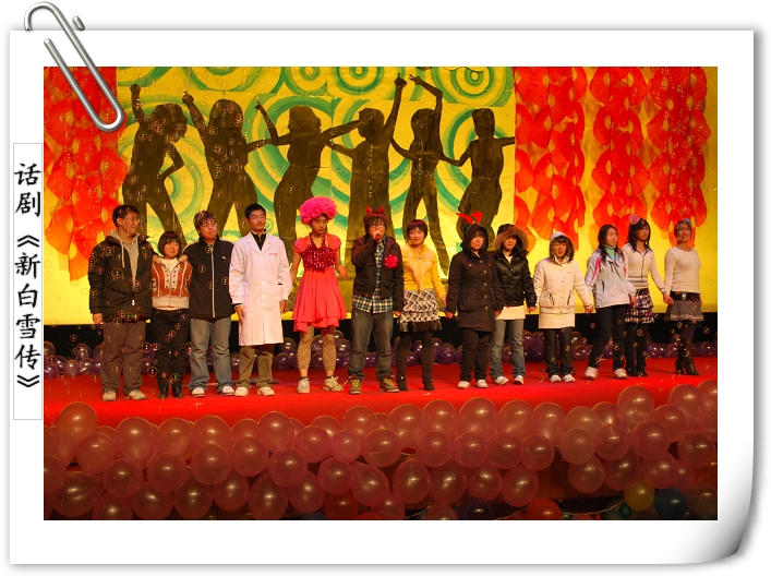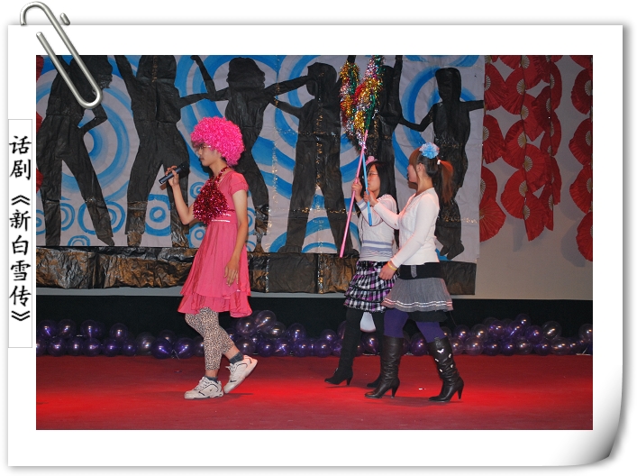 相声《我的老员工活》讲述了老员工活的各种趣事,充分体现了同学们初到大学的新奇、兴奋、烦恼和意外。话剧《新白雪传》以反串形式,配上诙谐的语言、夸张的动作和新颖的故事情节深深感染观众,幽默搞笑的节目让全场笑声连连,从而达到让大家放松心情的目的。