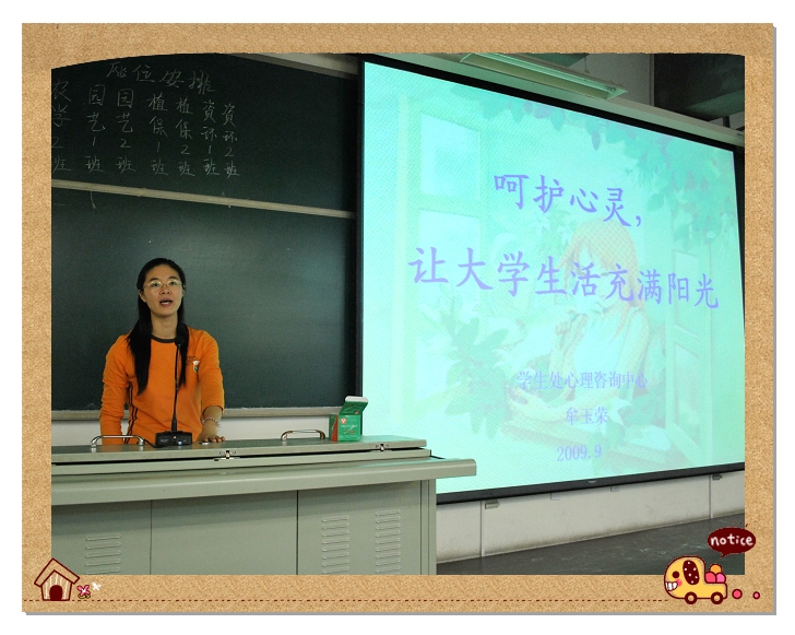 为了让大一新生更好的适应老员工活,在人际交往中不断锻炼自己、提升自己,9月23日下午1:30,太阳成集团tyc151cc在B103为新生举办了“呵护心灵,让老员工活充满阳光”讲座。会议特邀校员工处心理咨询中心牟玉荣老师担任主讲,太阳成集团tyc151cc副经理赵金芳,辅导员邬瑞杰和2009级全体新生参加了培训。