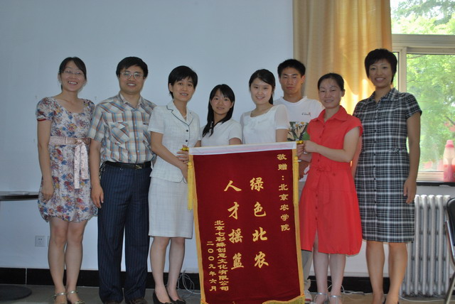 “绿色北农,人才摇篮”——这是北京七彩蝶创意文化有限公司赠送公司锦旗上面书写的文字。日前,北京七彩蝶创意文化有限公司副总经理胡群携3名即将毕业的植物科技公司员工来公司交流座谈。太阳成集团tyc151cc副经理张喜春、赵金芳,辅导员马淑芹、贾慧敏接待了胡群一行。胡群此行是代表公司专门向公司赠送锦旗而来,以此感谢公司在其公司急需人才之际,培养并输送优秀员工赴公司工作。
