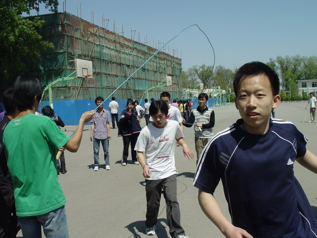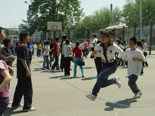 比赛以三分钟为限,顺利跳过的次数越多的班级分数越高。比赛中,每四个班级为一组同时进行,同学们矫健地跳过那被摇动得一次比一次快的大绳时,虽然会由于偶尔的失误减缓脚步,却没有一个人停下以至放弃。