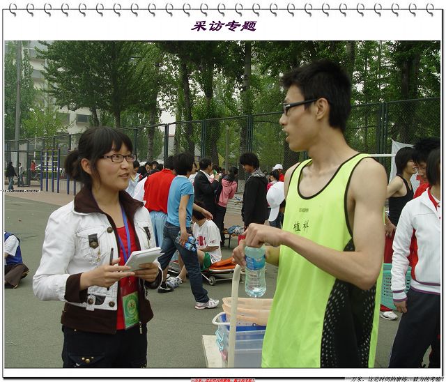 一滴滴汗水,飘在绿茵场上,伴随着矫健的步伐,奏出希望的乐章。在男子5000米决赛中,刘全同学取得了第三名的好成绩。采访时他表示,自己平时很喜欢跑步,比赛时一个人跑容易坚持不下来,但是如果后面有对手的竞争,就能激励自己能跑出好成绩。