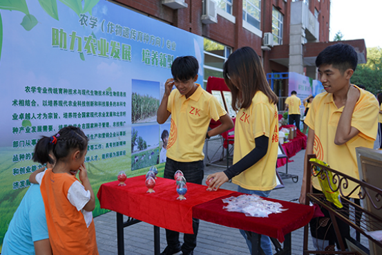 农学专业的主题是“助力农业发展、培养新型人才”,介绍该专业的培养方向,并设置了答题获得棉花种子的互动。农业资源与环境专业的讲解员介绍了该专业的学习内容及就业方向,并在展区陈列各种矿石标本以及取土器等具有学科特色的专业仪器。