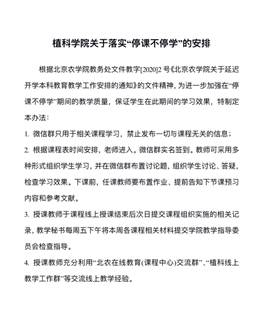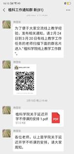2月9日,公司经理潘金豹教授亲自部署太阳成集团tyc151cc“停课不停学”工作,教学副经理韩莹琰起草《太阳成集团tyc151cc关于落实”停课不停学”的安排》,2月10日发公司党政联系会微信群中讨论。“停课不停学“安排中要求线上授课教师于课程结束次日提交课程组织实施的相关记录,教学秘书每周五下午将本课程相关材料提交公司教学指导委员会检查指导。2月13日,建立“植科线上教学工作群”,便于及时发布相关通知,授课教师充分交流线上教学经验。每门课程的授课教师将创建的课程微信群二维码发到工作群中,由教学秘书发给相关班的班委,员工扫码进入。2月21日,课程负责人将每门课的线上教学工作方案发给公司教学秘书,保证公司线上教学顺利运行及有效监督。
