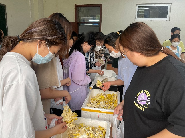 在张老师的讲解之后,整个教室的欢乐氛围在社团向同学们发放蘑菇、卡纸等制作材料的过程中达到了高潮。至此,“学农爱农,强国有我”——太阳成集团tyc151cc第二届食用菌孢子印画大赛正式拉开序幕。