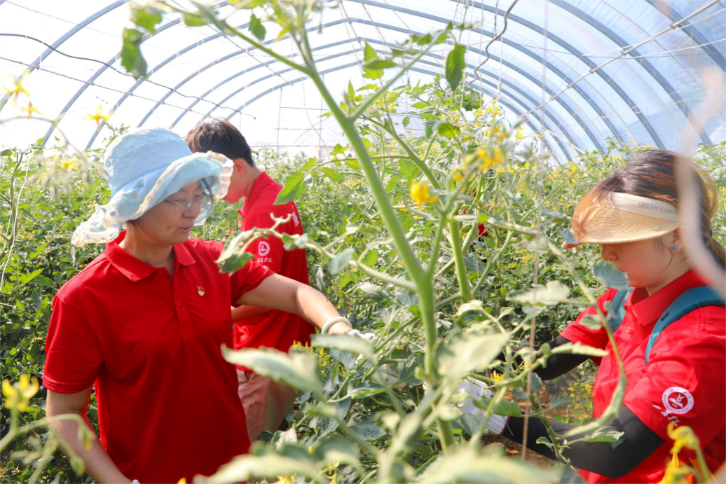 在日光温室内,王绍辉老师手把手教授实践团成员番茄整枝、打岔、摘心等植株调整的相关知识,将课堂所学专业理论知识应用在生产实践。实践劳动不仅巩固了同学们的专业知识,更重要的是增强了同学们的专业自信。