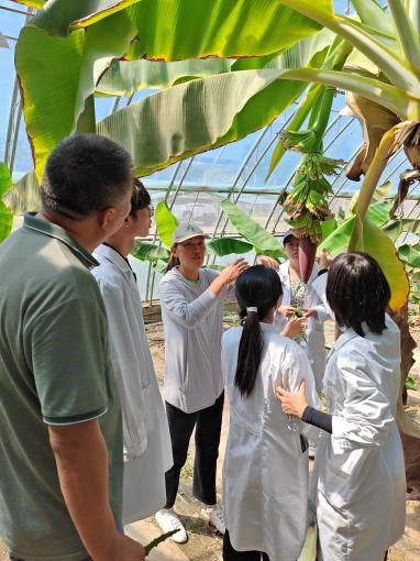 随后,刘经理将成员们带到各个温室大棚里参观,向同学们介绍了番茄穴盘整理技术、香蕉树后期处理技术、草莓种植技术、嫁接技术等,既增添了成员们的知识储备,也让同学们感受到了设施园艺生产一线技术的先进性。除此之外,实践团成员还学习到园区的现代农业育苗技术——机械化流水线穴盘育苗生产,认识到科学专业的技术对于大大提高育苗效率的重要性,意识到科技兴农才是未来实现农业现代化的方向。
