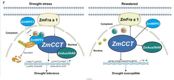 玉米是重要的粮饲兼用作物,干旱以及由禾谷镰刀菌(Fusarium graminearum)引起的赤霉菌茎腐病(Gibberella stalk rot)是制约玉米产量的两个重要因素。2017年,我们团队联合中国农业大学实验室克隆并鉴定出首个玉米抗茎腐病基因ZmCCT(Wang et al,New Phytologist,2017)。本研究中,我们发现ZmCCT兼具有抗病、抗旱等协同功能。我们通过对玉米近等基因系材料进行干旱胁迫处理以及过表达ZmCCT的转基因玉米植株均表现出较强的抗旱性。利用酵母双杂交等系统发现ZmCCT与三个全新蛋白ZmFra a 1、ZmWIPF2和ZmAux/IAA8蛋白互作。ZmWIPF2含有一个保守的RING-H2型结构域,具有很强E3泛素化酶活性,ZmAux/IAA8为生长素auxin早期响应逆境胁迫的重要因子。ZmFra a 1、ZmWIPF2和ZmAux/IAA8分别定位于细胞膜、细胞质和细胞核,有意思的是, 我们发现ZmCCT可以将细胞质定位的ZmWIPF2招募到细胞核。在干旱条件下,ZmCCT和ZmAux/IAA8调控下游重要干旱诱导基因的表达。该研究为解析玉米抗病、抗旱等逆境分子机制提供了重要的理论依据。