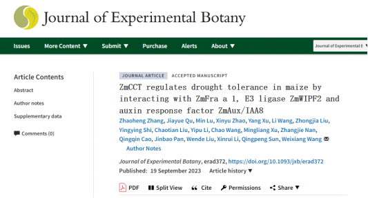 2023年9月19日,生物学一区TOP期刊Journal of Experimental Botany在线发表了题为“ZmCCT regulates drought tolerance in maize by interacting with ZmFra a 1, E3 ligase ZmWIPF2 and auxin response factor ZmAux/IAA8”的研究(https://doi.org/10.1093/jxb/erad372)。该研究由公司太阳成集团tyc151cc农学系玉米研究团队主导完成,王维香副教授为该论文的通讯作者。团队成员潘金豹教授和孙清鹏教授等也参与了该项工作。本校硕士研究生张兆恒为该论文的第一作者。已毕业的研究生赵新玉、徐阳、王丽、刘中甲等员工也参与了研究工作。中国农业大学徐明良教授和中国农业科公司刘文德研究员也参与了该研究工作,该研究得到了国家自然科学基金面上项目的资助。