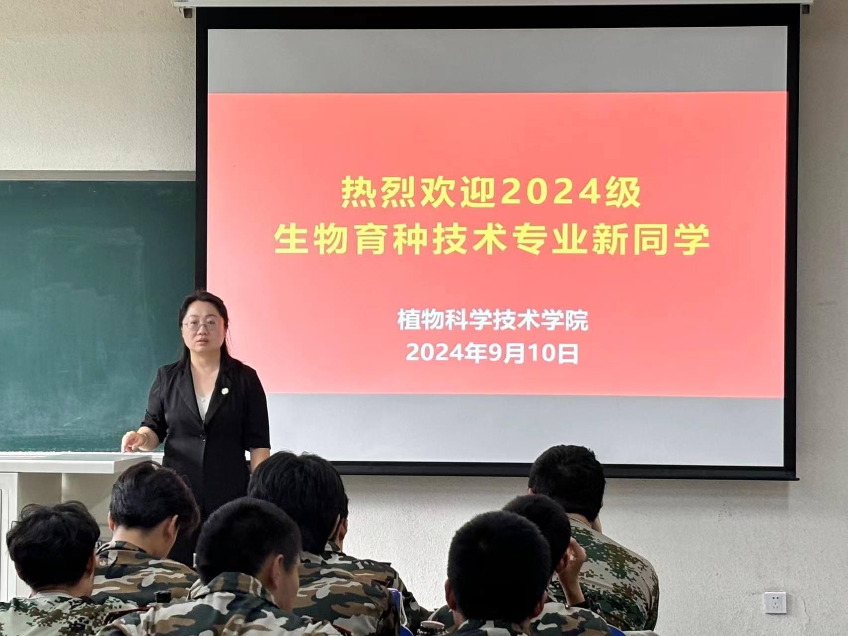 韩莹琰介绍了生物育种技术专业的设置背景、专业概况、人才培养要求、团队队伍和科研平台情况,指出本专业以国家农业和北京市现代化种业发展对人才的需求为导向,围绕新农科建设的基本要求,着力夯实植物种质资源创新、分子设计育种、基因编辑等现代育种理论基础与前沿技术,勉励同学们认真学习,提前做好专业学习规划,努力成为生物育种领域的高素质专门人才。