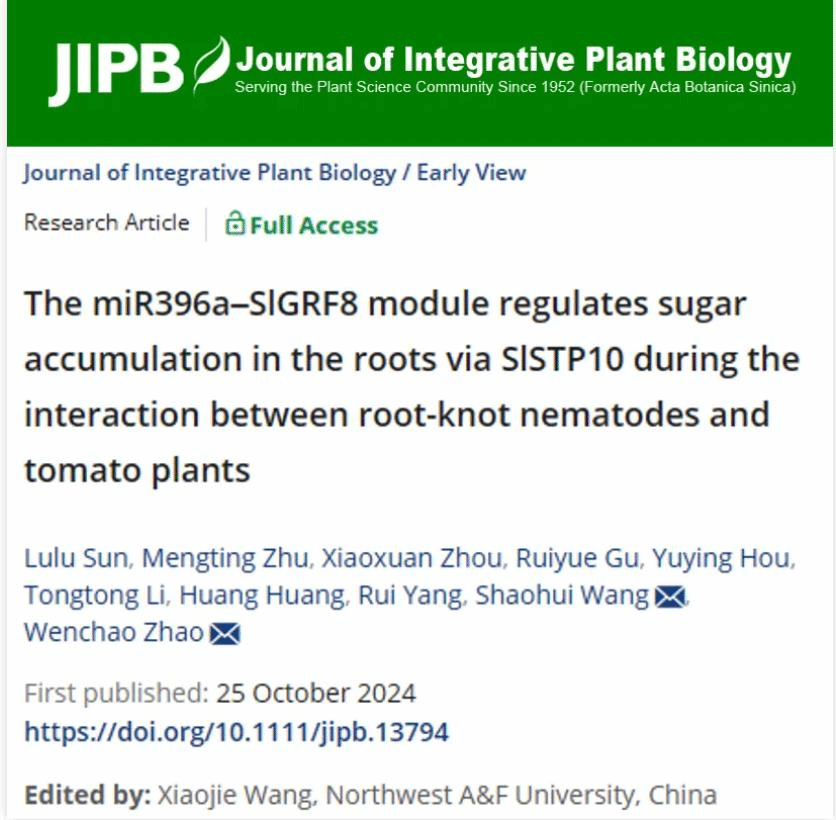 近日,JIPB在线发表了太阳成集团tyc151cc王绍辉/赵文超团队完成的题为“The miR396a-SlGRF8 module regulates sugar accumulation in the roots via SlSTP10 during the interaction between root-knot nematodes and tomato plants”的研究论文 (https://doi.org/10.1111/jipb.13794),该研究深入揭示了番茄与根结线虫相互作用中糖分竞争的分子机制,为探索植物-线虫互作机理奠定了坚实的理论基础。通过调控 miR396a-SlGRF8-SlSTP10 模块,可以有效调节番茄根系糖分分配,从而提高番茄对根结线虫的抗性,为线虫防治提供新的思路。