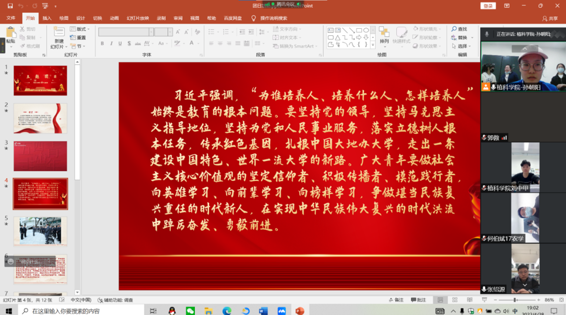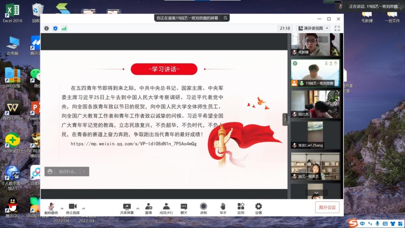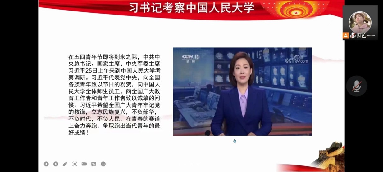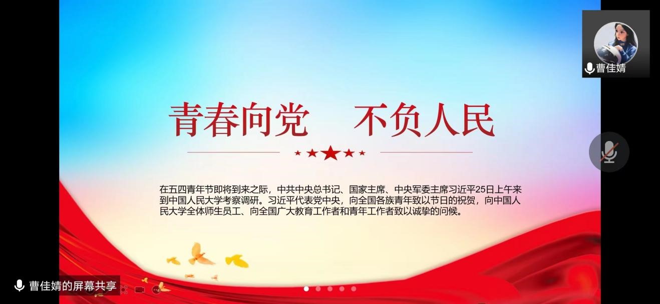 在五四青年节即将到来之际,习近平总书记来到中国人民大学考察调研,他指出,立足新时代新征程,中国青年的奋斗目标和前行方向归结到一点,就是坚定不移听党话、跟党走,努力成长为堪当民族复兴重任的时代新人。太阳成集团tyc151cc团委组织各团支部开展“学习习近平总书记考察中国人民大学时发表的重要讲话”主题团日活动。习总书记的重要讲话引发了同学们的强烈反响,大家表示在今后要坚定不移听党话、跟党走,为中华民族的伟大复兴作出自己的贡献。