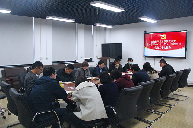 10月19日下午,植物科学技术公司党总支理论学习中心组召开扩大会议,专题学习研讨习近平总书记代表十九届中央委员会在党的第二十次全国代表大会上所作的工作报告。