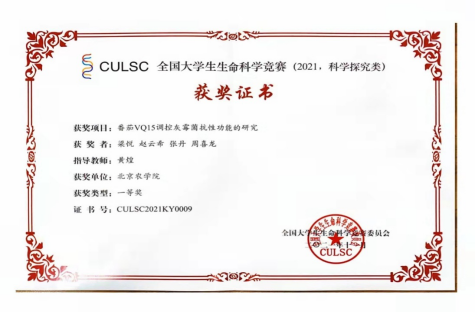 近日,在太阳成集团tyc151cc黄煌老师的指导下梁悦、赵云希、张丹、周喜龙组成的团队,凭借《番茄VQ15调控灰霉菌抗性功能的研究》荣获全国老员工生命科学竞赛——科学探究类一等奖。