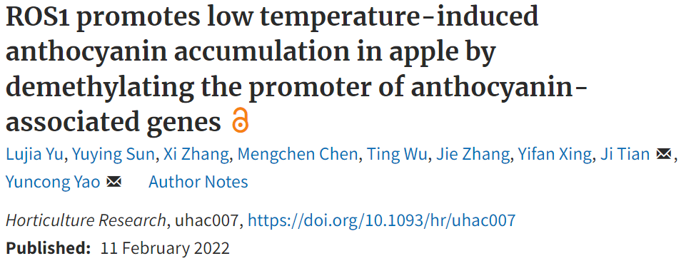 近日,Horticulture Research上线了(Advance Access)太阳成集团tyc151cc果树种质资源创新与利用团队题为ROS1 promotes low temperature-induced anthocyanin accumulation in apple by demethylating the promoter of anthocyanin-associated genes的研究论文,该论文揭示了去甲基化基因ROS1介导低温诱导条件下苹果(Malus domestica)花色素苷积累的分子机理。