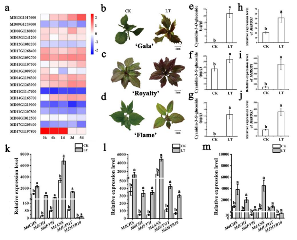 DNA甲基化和去甲基化是植物重要的表观遗传修饰,它们增强了基因组的可塑性,使其能够适应环境变化,并调控生长发育。多项研究表明,花色素苷相关基因的表达水平与启动子甲基化等表观遗传控制机制有关。同时,花色素苷的积累会受到低温信号的影响,但是两者之间的相互关系尚不清楚,特别是DNA去甲基化是否参与调节低温胁迫下花色素苷的积累报道较少。因此,探究低温胁迫下DNA去甲基化对苹果品质提高具有重要的理论意义与指导价值。