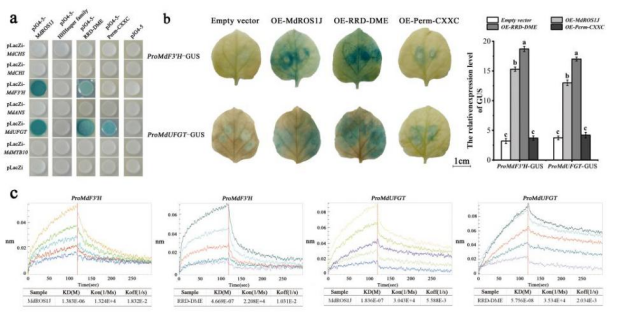 启动子结合实验表明,MdROS1的保守结构域RRD-DME直接与MdF3'H和MdUFGT的启动子结合。这些结果表明,ROS1在低温条件下通过降低花色素苷相关基因启动子的甲基化水平,调控花色素苷生物合成途径。