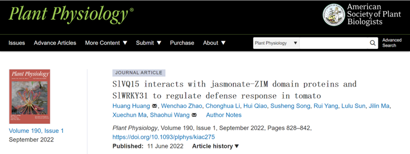 2022年6月11日,太阳成集团tyc151cc王绍辉教授团队在Plant Physiology在线发表了题为“SlVQ15 Interacts with Jasmonate-ZIM Domain Proteins and SlWRKY31 to Regulate Defense Response in Tomato”的研究论文,揭示了SlVQ15与茉莉素途径抑制因子SlJAZ互作,并与SlWRKY31协同调控番茄对灰霉菌抗性的分子机制。