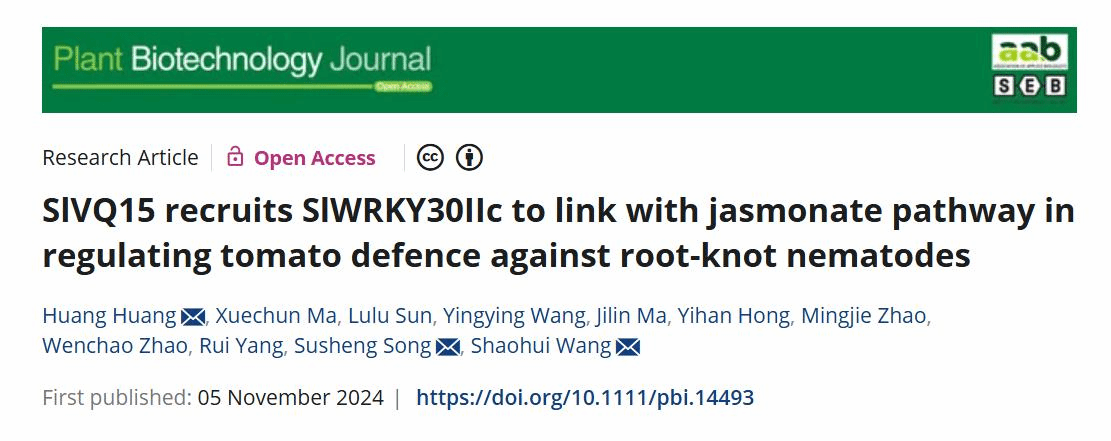 近日,太阳成集团tyc151cc王绍辉/赵文超教授团队、首都师范大学宋素胜教授团队在Plant Biotechnology Journal发表了题为“SlVQ15 recruits SlWRKY30IIc to link with jasmonate pathway in regulating tomato defence against root-knot nematodes”的研究论文。该论文揭示了SlVQ15招募转录因子SlWRKY30IIc,偶联茉莉素途径调控番茄应对根结线虫入侵的分子机制,为茄科植物的抗性育种提供新的思路。