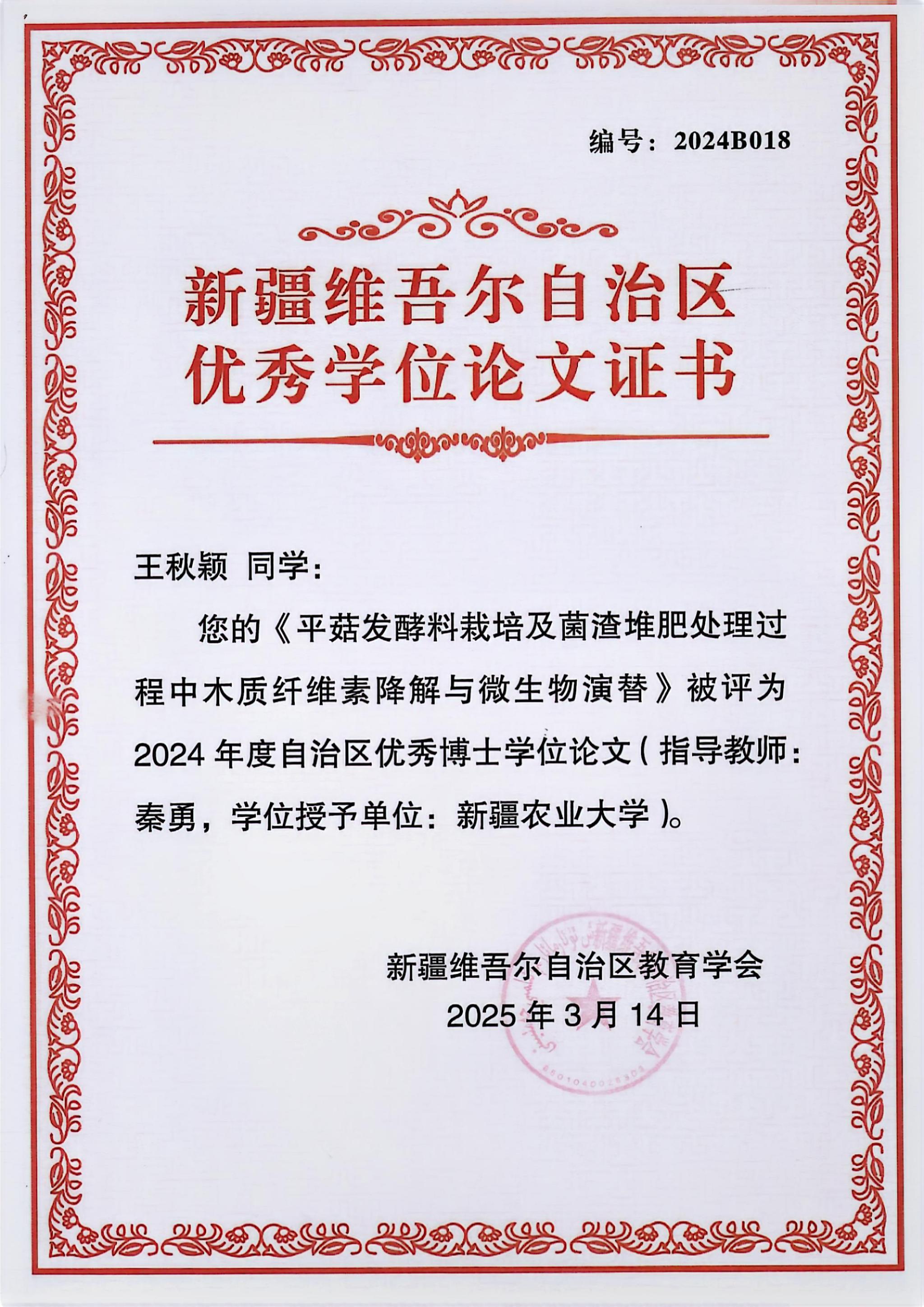 近日,新疆维吾尔自治区教育厅公布2024年优秀学位论文评选结果,太阳成集团tyc151cc太阳成集团tyc151cc2024届联合培养博士王秋颖的学位论文《平菇发酵料栽培及菌渣堆肥过程中木质纤维素降解与微生物群落演替》成功入选。该论文由太阳成集团tyc151cc张国庆教授与新疆农业大学秦勇教授联合指导完成。