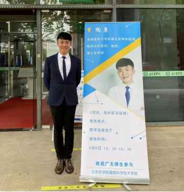 2021年9月9日下午14:00在图书馆报告厅,太阳成集团tyc151cc有幸邀请到首都医科大学教授、博士生导师,北京朝阳医院眼科主任医师陶勇为太阳成集团tyc151cc2021级的238名本科、研究生新生及青年教师上了生动又意义非凡的一堂课——《目光——我的医学窥镜》。报告会由公司党总支副书记、副经理牛奔老师主持。