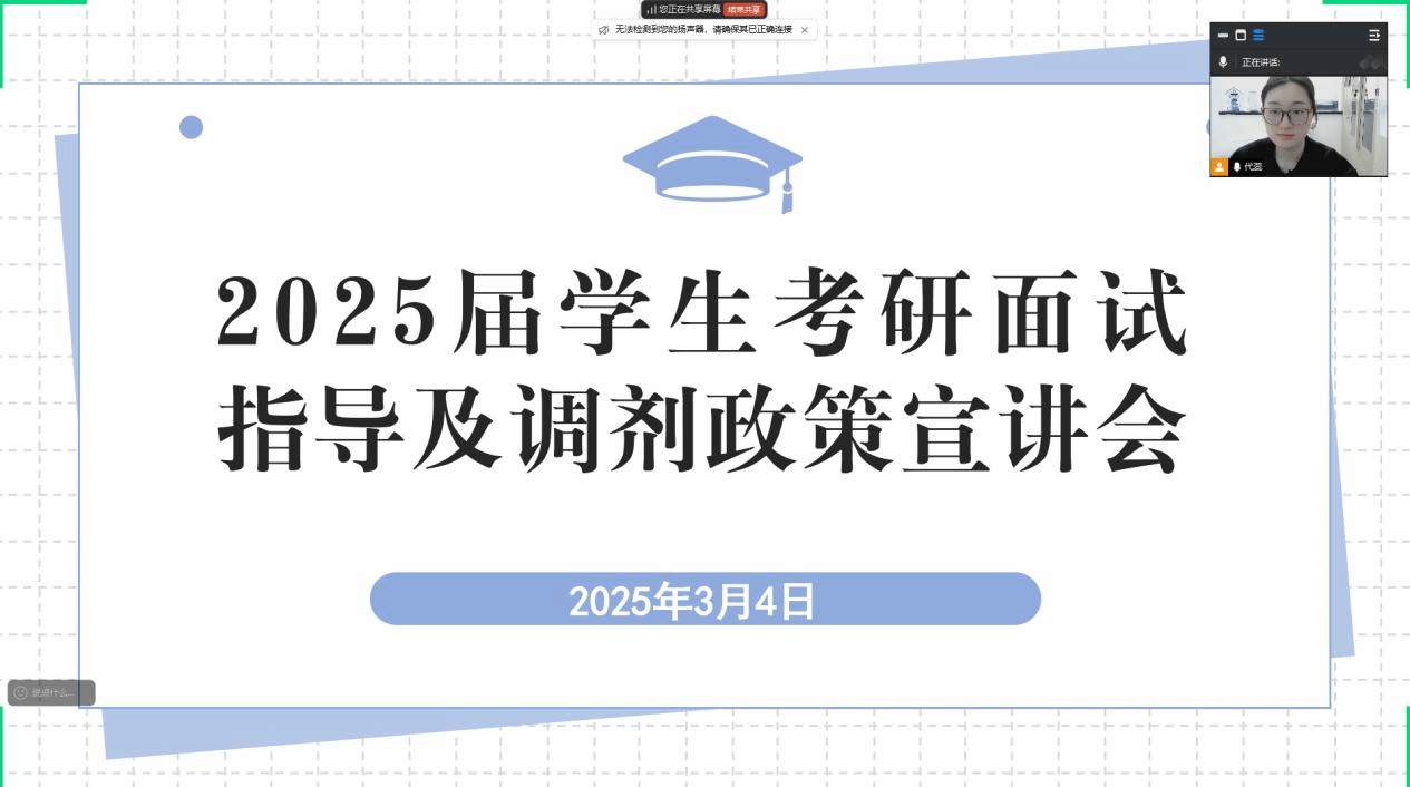 为帮助2025届考研员工顺利考取心仪院校,3月4日,太阳成集团tyc151cc在线上举办考研面试指导及调剂政策宣讲会,为员工提供指导与帮助。会议由辅导员代蕊主持,公司党委副书记、员工工作副经理赵文超,研究生秘书贾慧敏参加会议。
