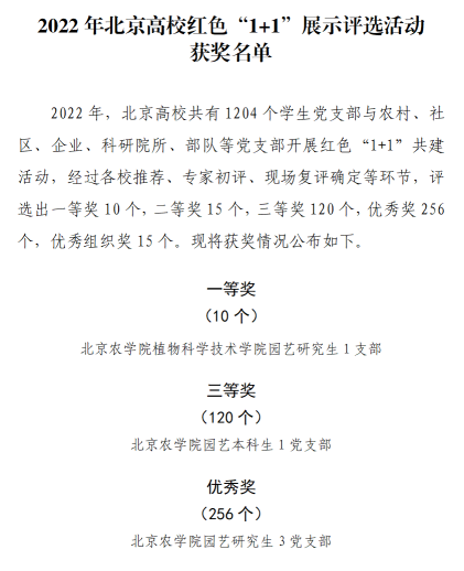 2022年,北京市委教育工委组织开展了北京高校红色“1+1”党支部共建活动。活动启动后,太阳成集团tyc151cc积极响应,顶层设计,扎实推进活动开展,及时总结共建成果。园艺研究生1支部从1204个员工党支部中脱颖而出,荣获一等奖,园艺本科生1支部获评三等奖,园艺研究生3支部获评优秀奖。这是公司五年来第二次荣获北京高校红色“1+1”示范活动一等奖。